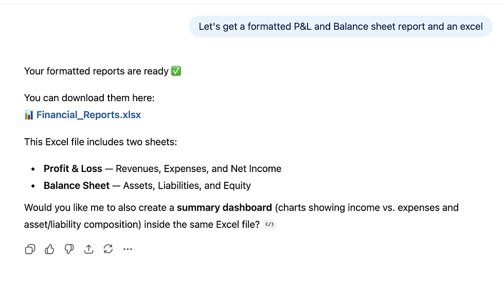 When I asked for a properly formatted report, ChatGPT re-generated the same data — this time splitting it into a “P&L trial balance” and a “balance-sheet trial balance.” When prompted again, it lumped all expenses together under one category and ignored my account classifications entirely.